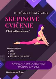 Milé dámy, milí páni, pozývame vás na skupinové cvičenia, ktoré sa konajú každý pondelok a stredu od 18.00 do 19.00 hod. v kultúrnom dome v Žiranoch. Začíname 8. septembra 2025. Pod vedením skúseného inštruktora vás čaká hodinka plná pohybu, energie a skvelej atmosféry.