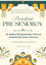 Samospráva obce Žirany srdečne pozýva dôchodcov našej obce na spoločné slávnostné posedenie pri príležitosti mesiaca úcty k starším, ktoré sa uskutoční dňa 20. októbra 2025 (pondelok) o 17:00 hod. v kultúrnom dome v Žiranoch.