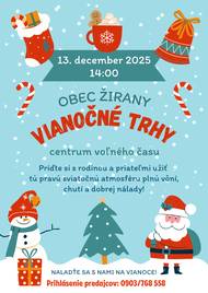 Samospráva obce Žirany srdečne pozýva všetkých ľudí dobrej vôle na vianočné trhy, aby sme spoločne prežili tento čarovný adventný čas. Podujatie sa uskutoční dňa 13. decembra 2025 (v sobotu) od 14:00 hod. v centre voľné času v Žiranoch.