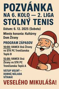 VAWEX OcÚ Žirany vás pozýva na ďalšie kolo 2. ligy, ktoré sa uskutoční v sobotu 6. decembra 2025 v priestoroch kultúrneho domu v Žiranoch. Čaká vás deň plný športového napätia, výborných výkonov a priateľskej atmosféry. Príďte podporiť domácich hráčov a užiť si kvalitný stolný tenis!