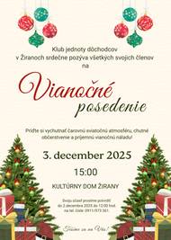 Klub jednoty dôchodcov v Žiranoch srdečne pozýva všetkých svojich členov na vianočné posedenie, ktoré sa uskutoční dňa 3. decembra 2025 (v stredu) o 15:00 hod. v kultúrnom dome v Žiranoch. Príďte si vychutnať čarovnú sviatočnú atmosféru, chutné občerstvenie a príjemnú vianočnú náladu!