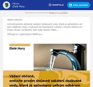 Vážení občané a návštěvníci Rejvízu. Vzhledem k akutnímu úbytku vody ve vodojemu na Rejvízu jsme byli nuceni, tuto vodu doplnit pomocí cisteren. A proto vás žádáme, abyste vodu až do odvolání nekonzumovali bez předešlého převaření. Děkujeme za pochopení. Služby města Zlatých Hor, a.s.