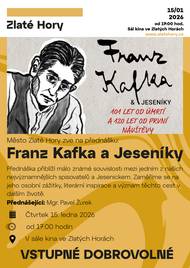 Město Zlaté Hory vás srdečně zve na přednášku Franz Kafka a Jeseníky Připomínáme 101 let od úmrtí a 120 let od první návštěvy Franze Kafky v Jeseníkách. 15. ledna 2026 v 17:00 hodin Kino Zlaté Hory Přednáší: Mgr. Pavel Žurek Vstupné dobrovolné