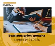 V pondělí 19. ledna 2026 budete mít opět možnost využít bezplatnou právní pomoc v době od 13:00 do 16:00 hodin, v zasedací místnosti, II. patro, dveře č. 14. na Městském úřadu ve Zlatých Horách.