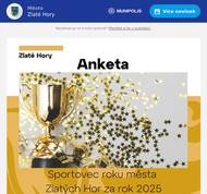 Město Zlaté Hory vyhlašuje anketu "Nejlepší sportovec Města Zlatých Hor za rok 2025". https://docs.google.com/.../1FAIpQLSftO7EZWL9.../viewform... Vyhlášeny budou níže uvedené kategorie: • přípravka do 10 let - včetně • žáci/žačky od 11 - 15 let - včetně • junioři a juniorky 16 – 18 let - včetně • muži a ženy od 19 do 50 let - včetně • veteráni 51 let a více • krajánek - sportovci pocházející ze Zlatých Hor působící v současné době ve sportovních klubech mimo město Zlaté Hory • trenér roku • osobnost sportu • sportovní akce roku • kolektiv roku • sportovní nej výkon Nominovat lze prostřednictvím e-dotazníku na webu města a facebookových stránkách nebo vypsáním anketního lístku v informačním centru do středy 11. února 2026. Jedná se o sportovce, kteří dosáhli úspěchů na mezinárodních soutěžích na celorepublikové, krajské a regionální úrovni případně na jiných významných akcích. Vyhlášení ankety proběhne v pátek 13. března 2026.