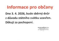 v pátek 3.4.2026, bude sběrný dvůr z důvodu státního svátku uzavřen.