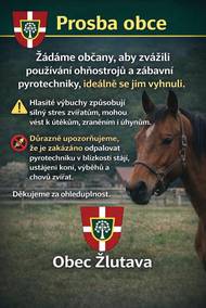 Obec žádá občany, aby zvážili používání ohňostrojů a zábavní pyrotechniky. Hlasité výbuchy totiž způsobují silný stres zvířatům, což může vést k útěkům, zraněním a úhynům. Důrazně upozorňujeme, že je zakázáno odpalovat pyrotechniku v blízkosti stájí, ustájení koní, výběhů a chovů zvířat. Děkujeme za
