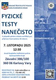 Chcete si vyzkoušet fyzické testy potřebné k přijetí k Policii ČR? Získejte certifikát platný 18 měsíců! 7. listopadu 2025 od 12:30 Krajské ředitelství policie Karlovarského kraje, Závodní 386/100, Karlovy Vary Zápis účastníků od 12:00 Co vás čeká: kliky, běh na 1 km, člunkový běh, celomotorický test Při splnění získáte oficiální certifikát pro přijímací řízení. Registrace: krpk.nabor@pcr.cz Tel.: 731 682 191
