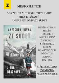 Autorské čtení knihy Anetchen, dívka ze Sudet, od Jitky Blažkové, se uskuteční ve středu 26. listopadu 2025 od 17:00 hodin v Muzeu Žlutice.