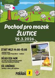 Město Žlutice srdečně zve všechny občany na Pochod pro mozek, který se uskuteční v neděli 29. března 2026.Přijďte podpořit zdravý pohyb, dobrou náladu a zároveň potrénovat paměť. Čeká vás příjemná procházka přírodou i drobné úkoly zaměřené na procvičení mozku. Start: mezi 14.00–15.00 hodin Trasa: Kamenka – Kaple Panny Marie – Loděnice Délka: cca 4 km Po cestě vás čeká trénování paměti. Upozorňujeme, že trasa není vhodná pro kočárky. Cíl: Loděnice V cíli bude zajištěno pití, buřty si vezměte s sebou.
