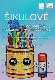 RC Setkání zve všechny školkáčky na výtvarný kroužek ŠIKULKOVÉ. Kroužek se bude konat každou středu od 15:30 do 16:30 v herničce RC. Vstupné 50 Kč/dítě. Kroužkem bude provázet lektorka Kateřina Kupková. První hodina již 7. 1. 2026. Těšíme se na vás.
