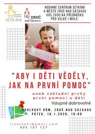RC Setkání srdečně zve na přednášku ABY I DĚTI VĚDĚLY, JAK NA PRVNÍ POMOC. Malí i velcí poznají základní prvky první pomoci u dětí. Přednášku můžete navštívit 16. 1. 2026 od 16:00 ve Spolkovém domě. Vstupné dobrovolné. Těšíme se na vás.