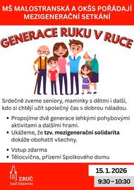 OKŠS a MŠ Malostranská pořádají mezigenerační setkání, které se bude konat 15. 1. 2026 od 9:30 do 10:30 v tělocvičně Spolkového domu. Zváni jsou senioři, maminky s dětmi i další, kdo si chtějí užít společný čas s dobrou náladou. Vstupné je zdarma. Těšíme se na vás.