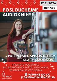 Trápí vás málo času na čtení? Co takhle zkusit knihy poslouchat? Jak poznat kvalitní audioknihu? To a mnohem více se dozvíte na přednášce spisovatelky Kláry Smolíkové – POSLOUCHEJME AUDIOKNIHY. Akce se bude konat 17. 2. od 17:00 ve Spolkovém domě. Vstupné 100 Kč. Těšíme se na vás.