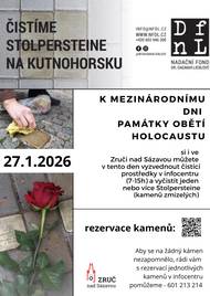 Zruč nad Sázavou se opět po roce připojí k akci čistíme Stolpersteine na Kutnohorsku. Čistící prostředky si zájemci mohou vyzvednout v den konání akce v infocentru. Aby se na žádný kámen nezapomnělo, využijte rezervační formulář k jednotlivým kemenům. https://nfdl.short.gy/cistime2026.