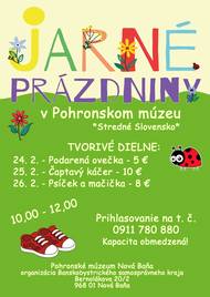 Pohronské múzeum - organizácia Banskobystrického samosprávneho kraja pripravilo na Jarné prázdniny Západného a Stredného Slovenska tvorivé dielne od 17.02. do 26.02.2026 v čase od 10:00 - 12:00 hod. Prihlásiť sa môžete na tel.č. 0911 780 880. Kapacita obmedzená!