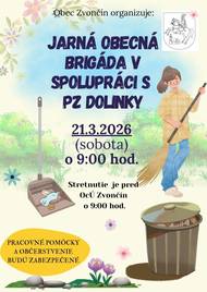 Obec Zvončín v spolupráci s PZ Dolinky pozýva občanov na jarnú obecnú brigádu, ktorá sa uskutoční v sobotu 21. marca 2026. Stretnutie je pred OcÚ Zvončín o 9:00 hod. Spoločne pomôžme skrášliť naše okolie, vyčistiť verejné priestranstvá a pripraviť obec na jar.