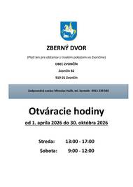 Vážení občania, od 1. apríla 2026 do 30. októbra bude zberný dvor otvorený nasledovne: streda 13:00 - 17:00 a sobota od 9:00 - 12:00.