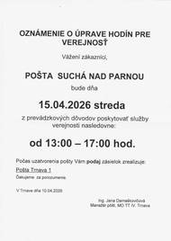 Pošta Suchá nad Parnou oznamuje, že dňa 15.04.2026 (streda) bude poskytovať služby verejnosti v čase od 13:00 -17:00 hod.
