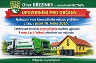 UPOZORNĚNÍ PRO OBČANY Náhradní svoz komunálního odpadu v Nectavě proběhne zítra, v pátek 16. ledna 2026. Z technických důvodů je nutné přistavit popelnice výjimečně k domu č. p. 6 (Valíkovi), odkud bude svoz realizován. Popelnice je nutné přistavit od 06:00 hod., ideálně již dnes, neboť přesný čas svozu odpadu není určen. Děkuji za pochopení. -JW-