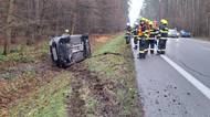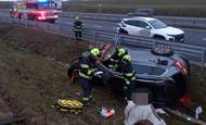Osobní auto přeletělo na sjezdu D11 svodidla a skončilo na střeše