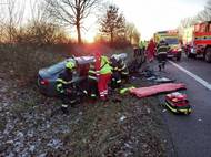 Srážka tří aut u Úlibic poslala osm lidí do péče lékařů, hasiči nasadili hydraulické vyprošťovací zařízení